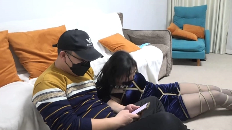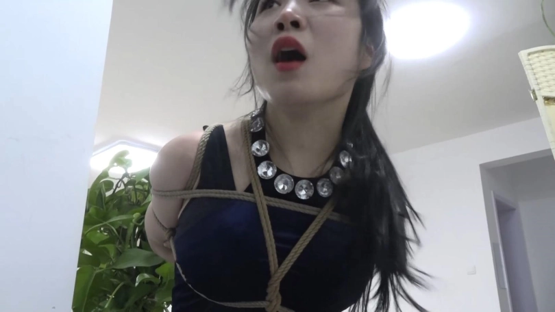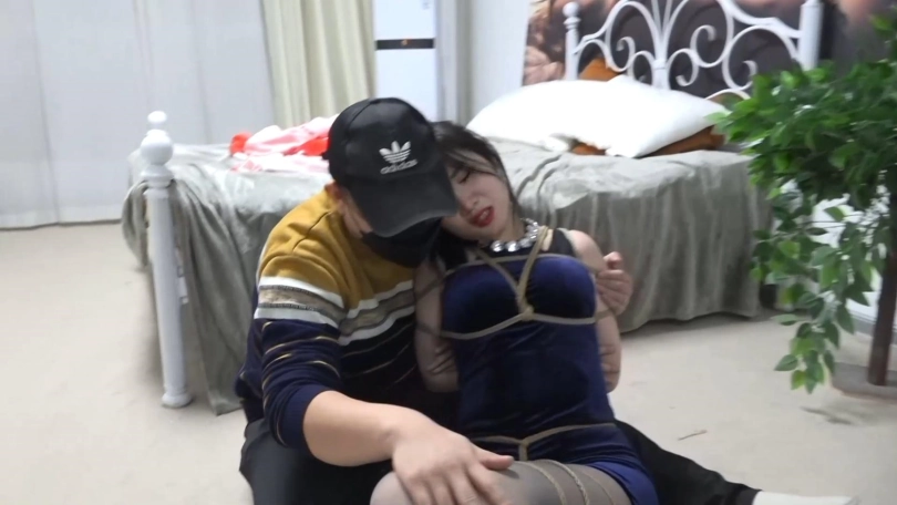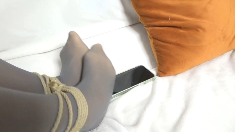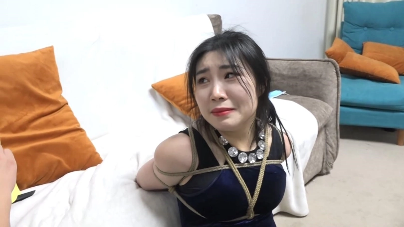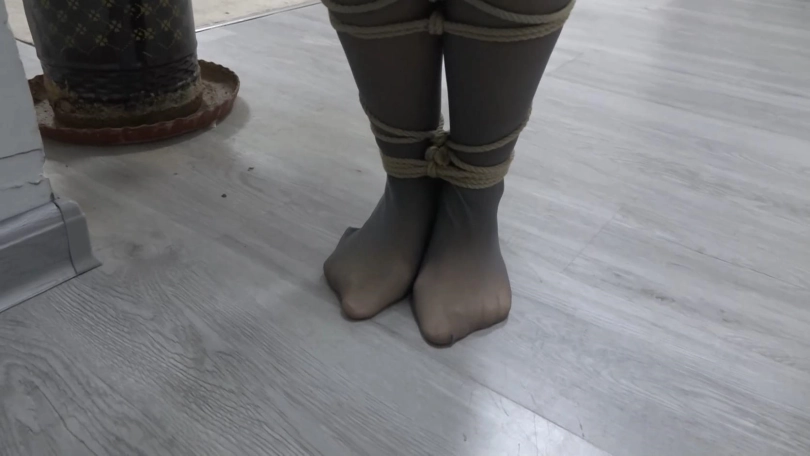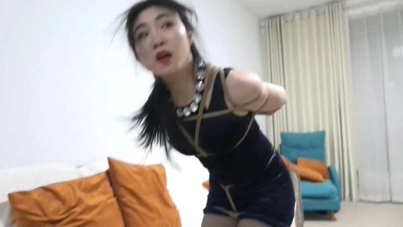 她于是回到客厅地板上,扭动着想解缚。但就是她手够到绳结时却自己握拳了,不让她解缚。