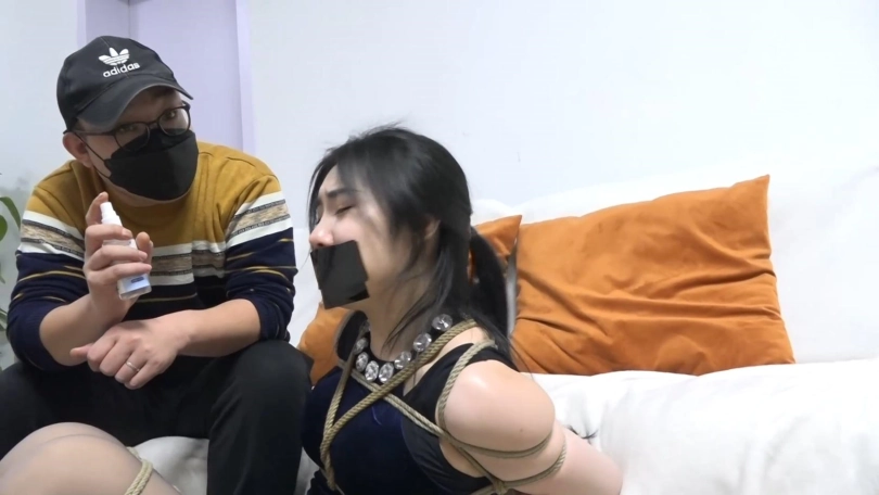美女害怕的摇头,但被大师用胶带封嘴,这次真的说不出话了。