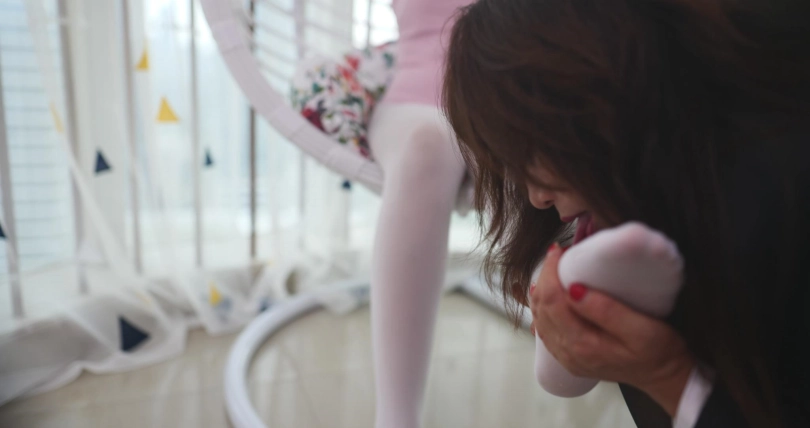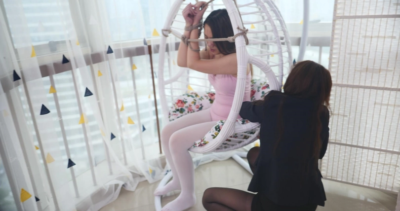 老板让女主在地上挣扎,忙完工作后走过去给她脱下衣服,还换了芭蕾服,将女主绑在吊椅上, 开始摸女主。女主急道:“这个尺度之前没有说过啊!”
