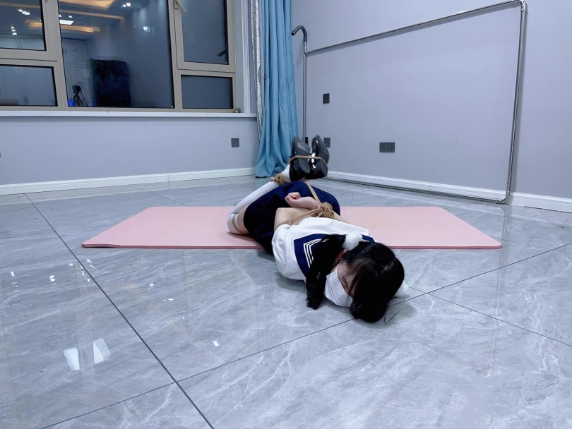 过了一会儿,茶茶醒来发现自己被绑着,急忙挣扎了一会儿,然后慢慢地下床,一蹦一跳地逃出房间,朝着大门跳去。就在茶茶准备开门的瞬间,坏人回来了,坏人见状,不管茶茶被绑住的双脚,便将茶茶拽回了房间里,然后加固了茶茶的拘束(在原来的基础上绑住小腿,然后从背后引出绳子绑成驷马)。坏人询问茶茶银行卡密码,茶茶慌乱中随便说了个密码,坏人见密码到手,立刻用口球堵住了茶茶的嘴,然后出门取钱了。