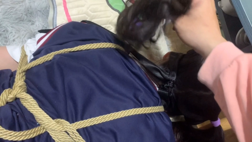 ,把驷马绳子直接卷成股绳了,双脚不停的乱动,再把黑丝小脚完全抓在手上,用腿夹紧两只丝足,这下就跑不掉咯