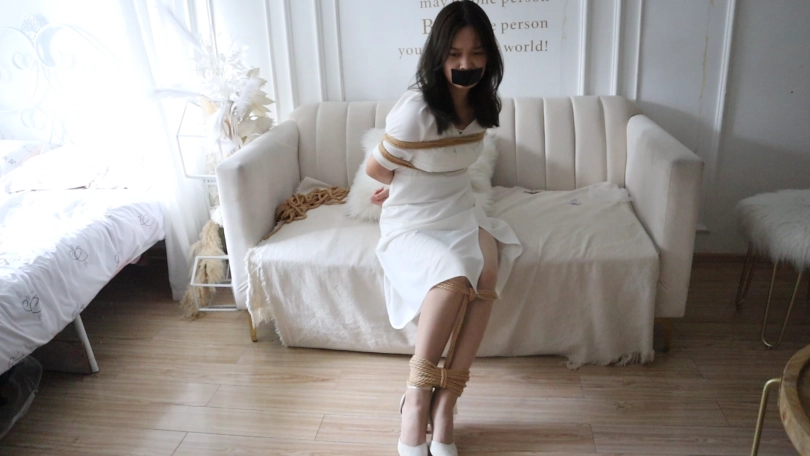 萧玥姐姐的白裙肉丝高跟装,非常好看很有仙气的一套装束,被强制封嘴,戴超级大的银色口球,