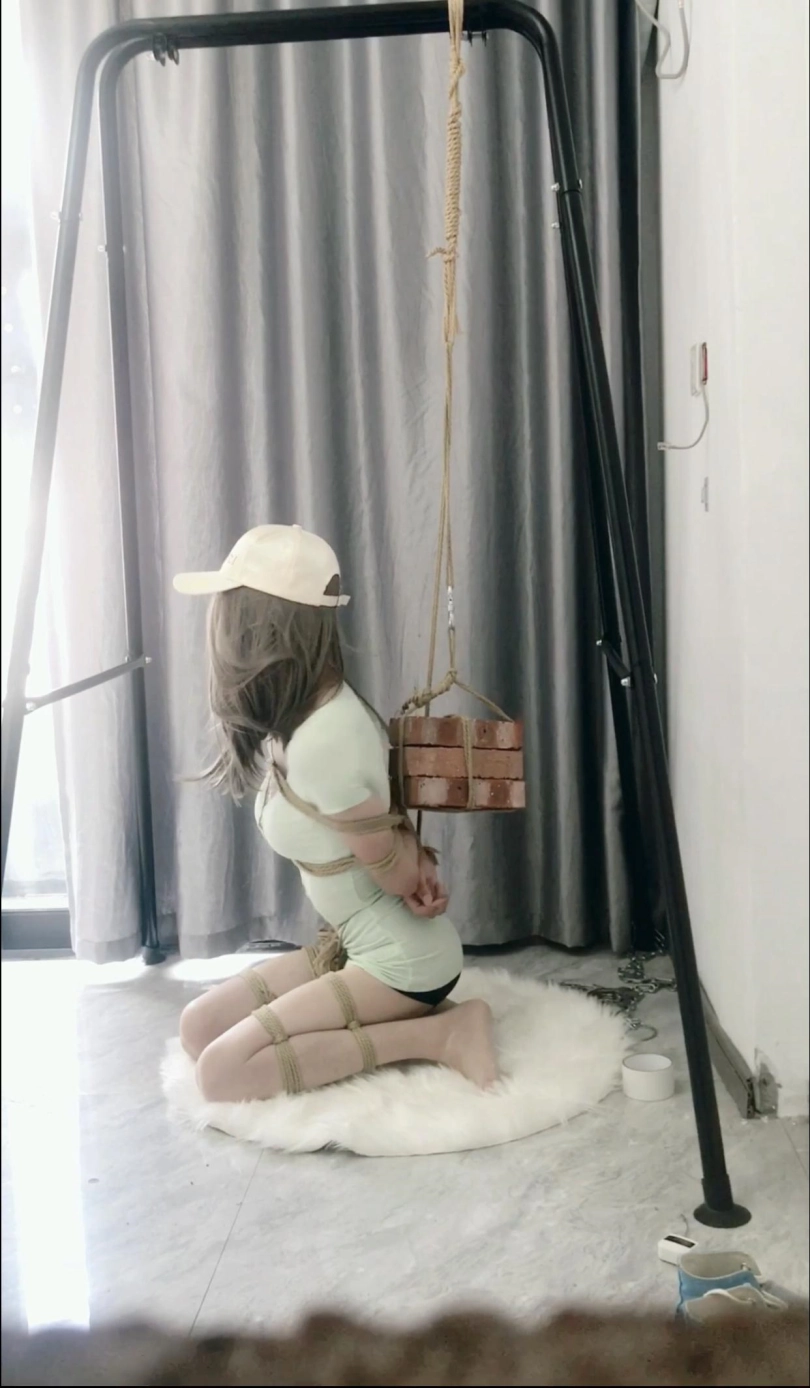 本来想是在上次那样吊着的方式基础上加上这样的股绳的,但是上次确实手臂非常疼,就这样简单的尝试了一下,有些简陋但是难受了还是一样的难受的,这块砖想吊高点的,因为老是碰撞着自己的后背,很不舒服。结果太重了,而且只能捆上双腿之后才能加这个股绳,不然慢慢捆上双腿时间太长了很难受,所以捆上双腿之后就站不起来了,活动受限,要是太高的话我拿不起来。一个人完成有些不美观见谅,下次有足够的时间在慢慢尝试拍摄~