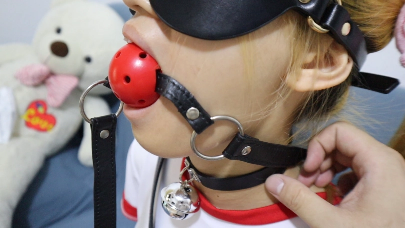 强制驯服的塞入口球到嘴里,把嘴撑到最大,