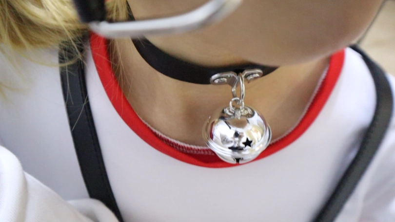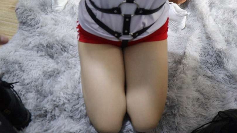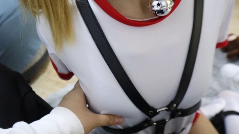 全身绑上拘束带,脖子戴项圈,