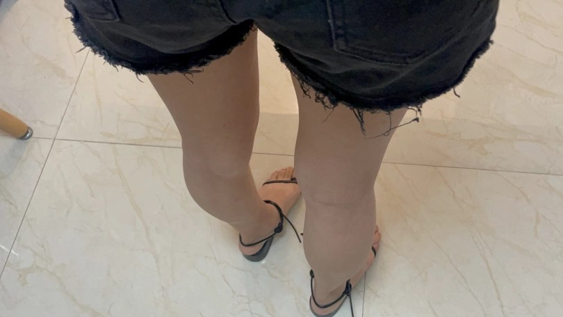 室内,罗菱菱穿着日常的裙子,穿着黑色凉鞋(镜头开始是全身,然后放大,从上往下拍穿着鞋的脚的特写,约两分分钟)。然后小茜拿着短牛仔裤和白色T恤,去房间换上短牛仔裤和T恤,脚上穿着黑色凉鞋出现在镜头面前。(镜头移动。相机倾斜60度这样,拍大腿到脚的下半身部分,就是大腿和脚要同框。再镜头放大,特写穿鞋的脚)。然后坐凳子上,慢慢脱下凉鞋,穿上船袜,穿上运动鞋,戴上手铐和脚镣,来回走动一下。然后坐在凳子下,慢慢脱下一只脚的运动鞋和船袜,穿上凉鞋。再脱下另一只脚的运动鞋和船袜,穿上另一只脚的凉鞋。把手铐打开,双手背在后面,走来走去,拿起手机,玩一下手机(镜头多拍一下模特穿着凉鞋的脚,多拍一下下半身部分)。