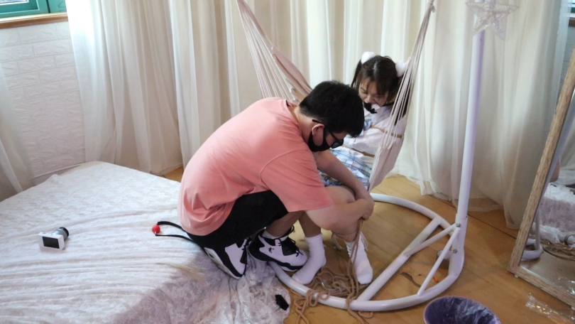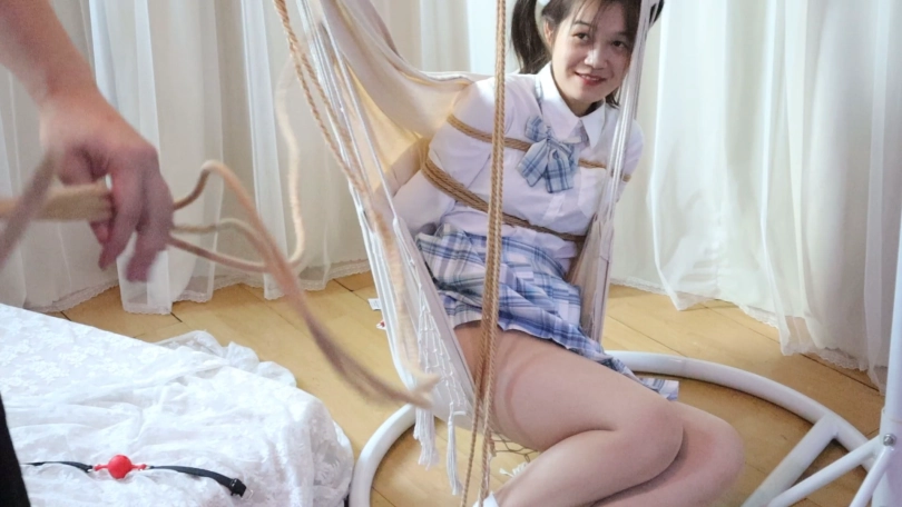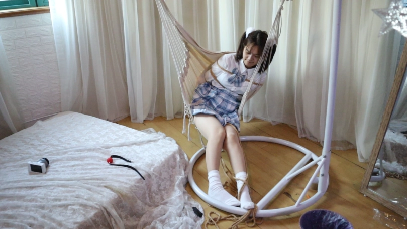 后直接把娇弱的少女绑在吊篮上面,把洁白的棉袜小脚高高的吊起来,姿势绝佳!