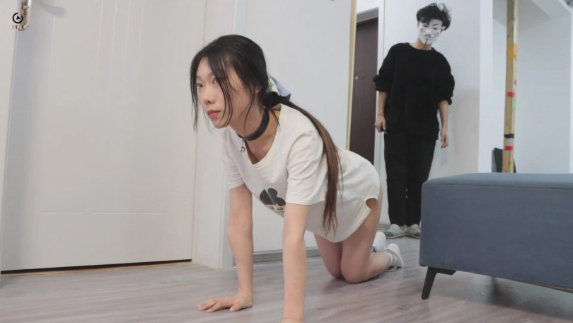 然而,当‘劫匪`撬锁进入房间后见到小月的那一刻,便吃了一惊,小月没有起疑,反而夸赞起大山的专业,而后撩起衣服,展示被绳索捆绑的身体,见他仍然无动于衷,便想着是大山想让她主动一些,便以小狗一般的姿势将项圈的缰绳系好,将其交给她的‘劫匪`先生。