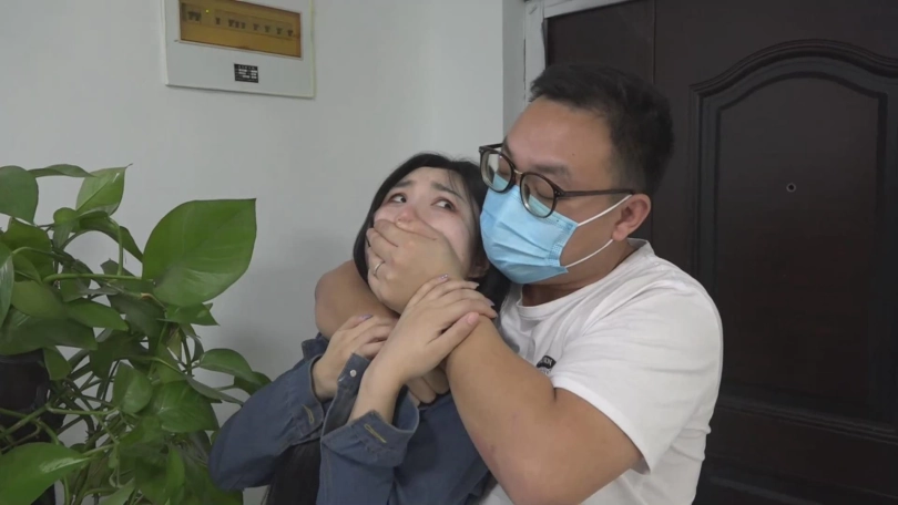 这时候门被敲响了,口罩男感觉是姐姐到了,起身去开门,妹妹大声呜呜的喊叫,企图提醒姐姐,被口罩男恶狠狠的警告了:别多事,要不没你好下场!