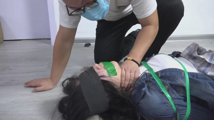 口罩男从包里拿了个毛巾,要塞到了姐姐的嘴里。姐姐特别不愿意,左扭又扭,口罩男捂住姐姐的鼻子,姐姐被迫张嘴呼吸,就这个空档,被口罩男用毛巾塞住了嘴。