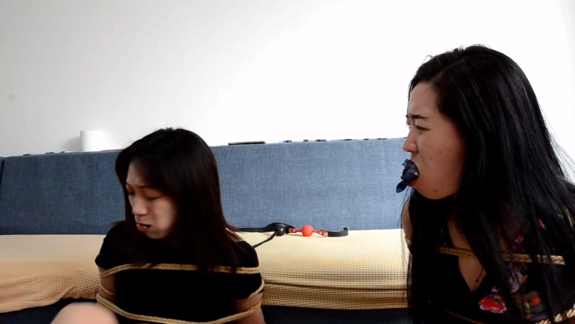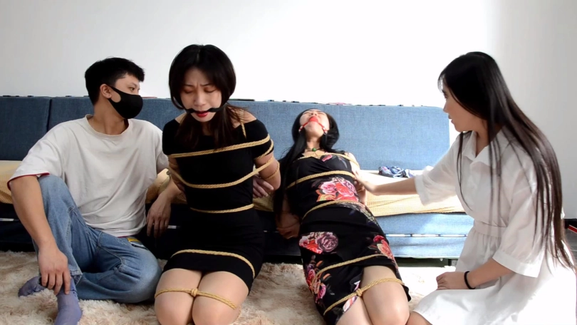 姐妹愤怒瞪向小雨和她男友,小雨一看心说你们还不服,和男友将二女捆成驷马,接着拿手机给她们拍照,还故意拿给她们看加以羞辱,二女拼命挣扎呜呜闷哼瞪向小雨。
