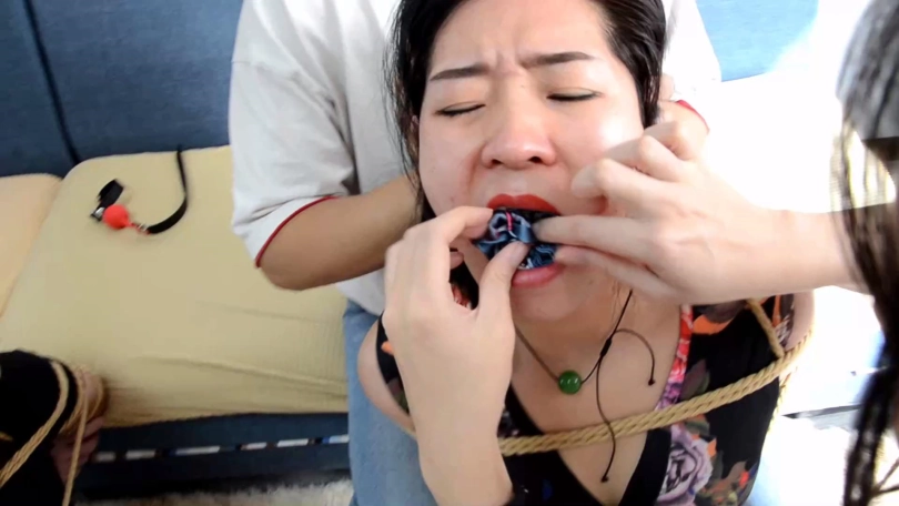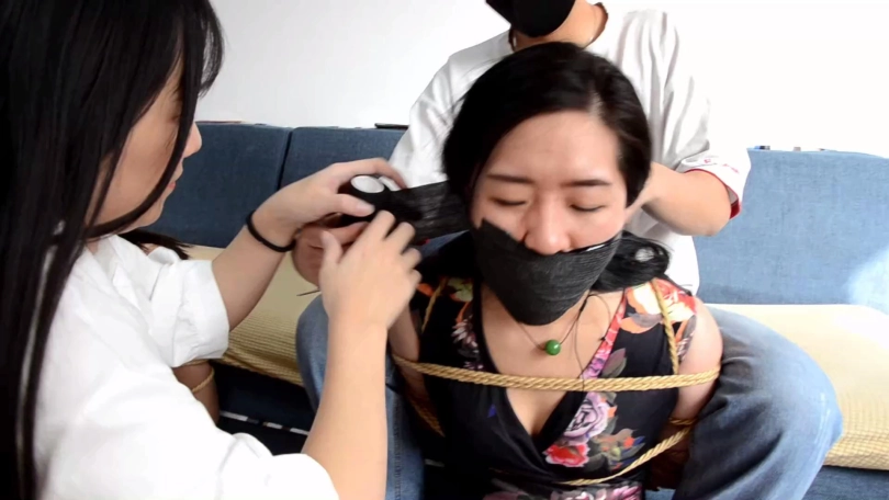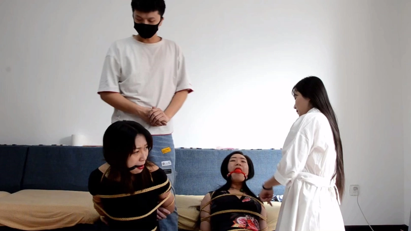小雨说送姐妹二人点礼物,拽出姐妹二人口中塞口球后,与男友配合分别把两条丝巾塞入姐妹二人口中,而后与男友到卧室收拾东西准备跑路。