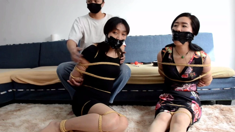 情侣二人从卧室出来回到客厅,王蕾和王千雅还以为他们这么快收拾完东西,要还钱了,没想到被他们扑倒袭击结结实实捆绑起来,嘴里带上塞口球。