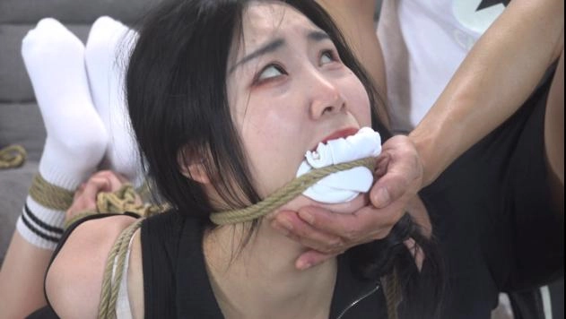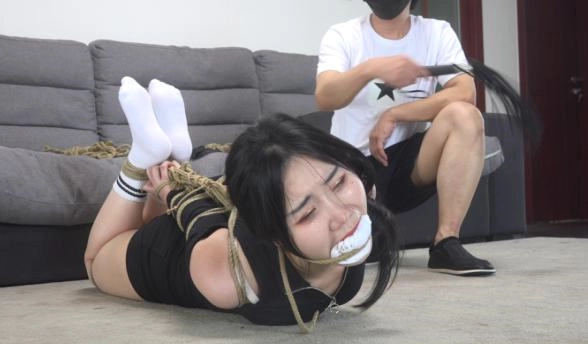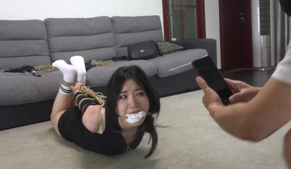 美女老板(吴晗)做生意失败欠下一屁股的债务,这天她正在玩着手机抱怨着没有钱了,门铃响了,外卖来了,她出去开门不料到进来一个歹徒用刀将她控制住,然后让她下跪并对她搜身,接着歹徒掏出绳子将她上半身直臂捆绑起来,捆绑双手结实后,脱了她的马丁靴露出白色棉袜,然后捆绑她双腿和膝盖,捆绑好后挠脚心,全身TK,并问到:还不还钱?美女摇头道:我没有钱没有钱,一会歹徒见此计不成,就用一双袜子塞到美女嘴巴里,接着绳子将嘴巴捆绑上。随后让美女趴在地上,然后用绳子给她捆了个驷马倒攒蹄,收绳紧上半身翘了起来,接着为了让她难受,还用绳子绑住她的头发让她强制抬头,捆绑结实后歹徒开始鞭打她,踢她,美女依然不肯还钱,恼羞成怒的歹徒只好对自己老大说:让她来抵债。随后给她拍照片进行了羞辱,接着歹徒离开,让美女继续挣扎。一会歹徒回来,踹了美女几脚,确认美女只能呜呜呜后,又用黑布蒙住了她的眼睛,捆绑堵嘴蒙眼结实后离开,让美女在地上挣扎。