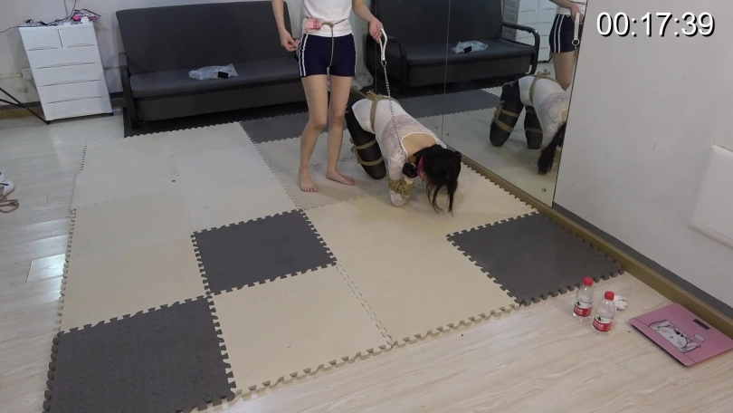 Part2:两人手臂和腿部都被折叠捆绑,通过地上爬行将棒子用嘴叼回,先叼回三根的获胜并获得100元奖励。失败的接受惩罚,需要被获胜者牵着狗链爬行,之后再被吊起固定。