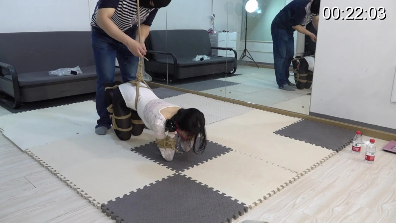 Part1:两人上身被直臂捆绑,腿被折叠捆绑。两人同时出发,看谁能先将盒子里的棒子用嘴叼回,先叼回3根的获胜并获得100元奖励。失败的接受惩罚,需要被获胜者牵着用膝盖行走,之后再被直臂吊起来。