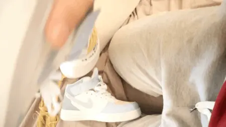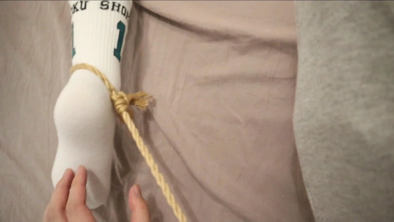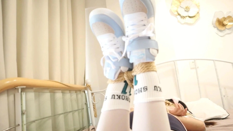 再脱下AJ篮球鞋,露出穿着白丝的运动白棉袜,进行下一轮的侵袭把