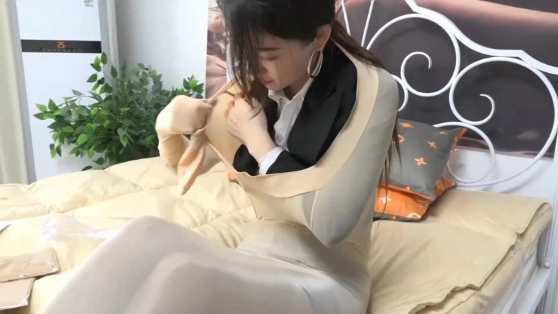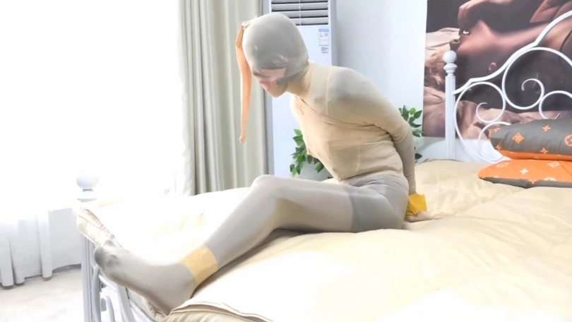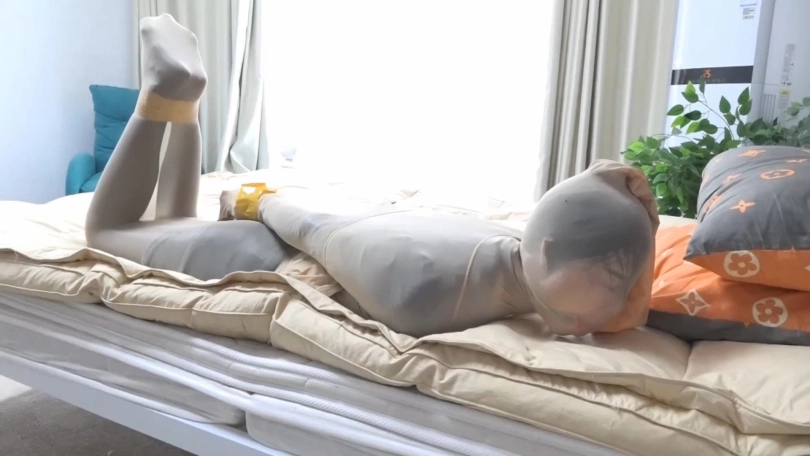 收到新袜子后,柳洋在床上试着袜子的弹性,居然还有点油亮呢,这时被一个入门劫匪盯上了,被偷袭捂晕了,醒来就发现自己已经被完整的丝袜全包起来,手脚还被胶带捆绑,嘴戴上了口球。