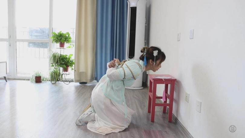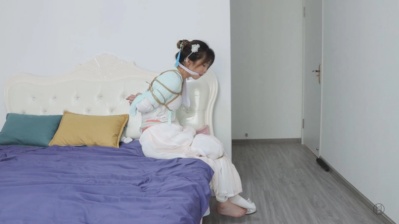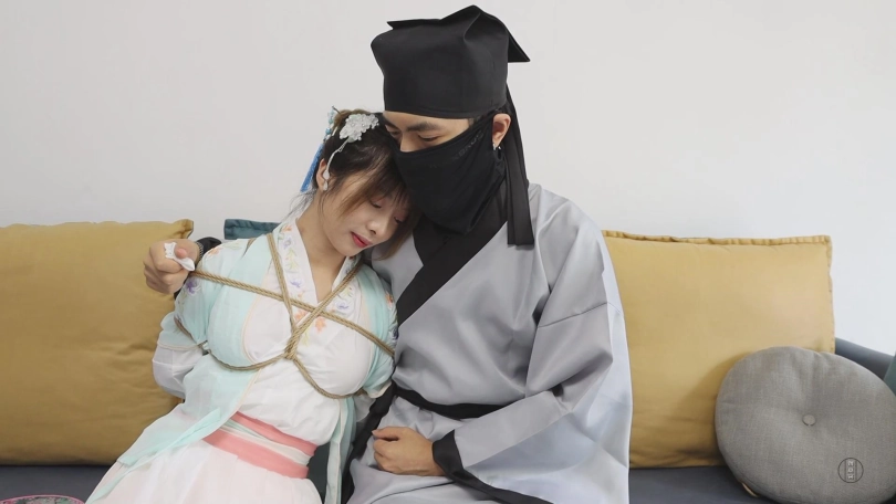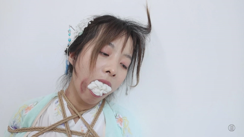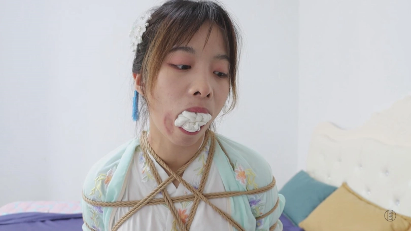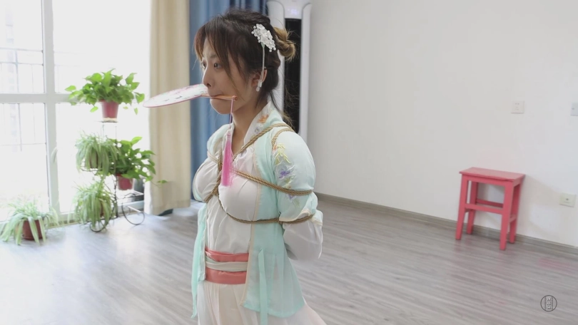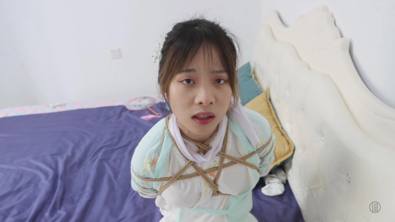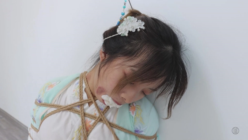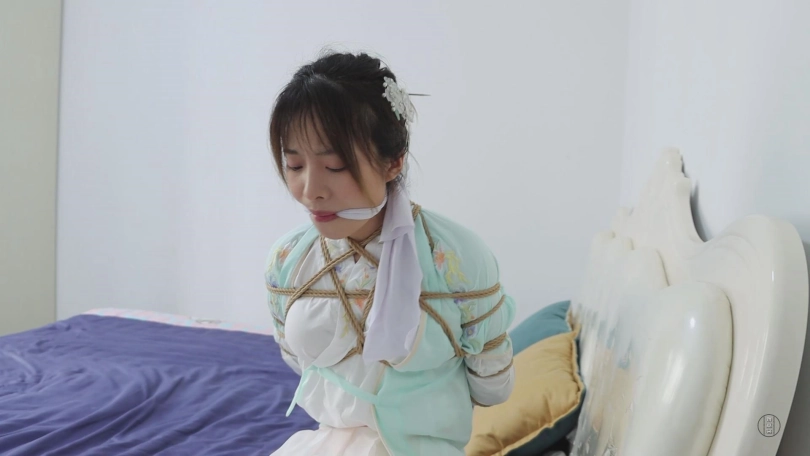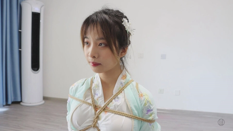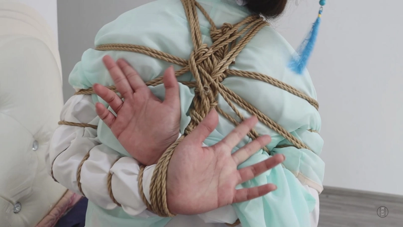 绳索游走在洁白的汉服之上,云瑶顺从的配合着巩生让他将自己的自由夺走,甚至叮嘱巩生要绑的紧一些,这样便更能证明自己的忠诚。待绑缚完毕,精美的绳网在云瑶身上错落有致的分布着,背着双手的云瑶仿佛折翼的天使一般,令巩生着迷。