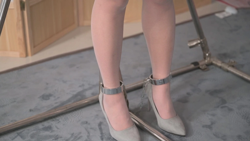 萱萱上身捆绑后,用一根绳子连在架子上部的登山扣上,登山扣可以跟随一起滑动,这样可以来回走动并起到束缚固定的作用。绳师让她两腿跨过一根钢管,并用脚镣拷住双脚,钢管的高度使她只能踮起脚尖,为了让她乖乖走起来,绳师先是来了一个小调教。萱萱特别惧怕那个电击器,于是绳师用电击器边电边驱赶她来回走,真是比鞭子好使多了。等她听话了,就给她换上高跟鞋,高跟鞋里放进去绿豆,然后让她走起来,她受不了了,再让她脱掉高跟再踮着脚走。