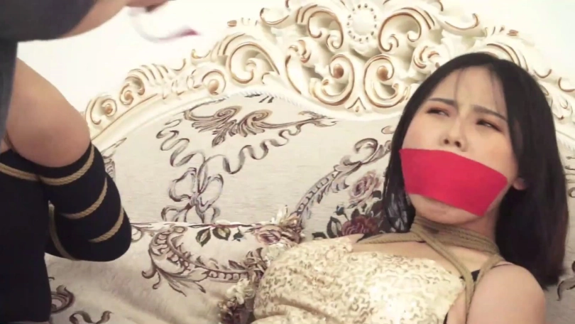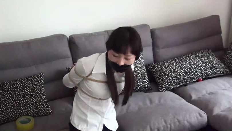 片段9:模特晓璐被一条黑色女式内裤塞嘴,嘴外被黑色电工胶带封住,外面缠绕黑色静电胶带与白色弹力自粘绷带。