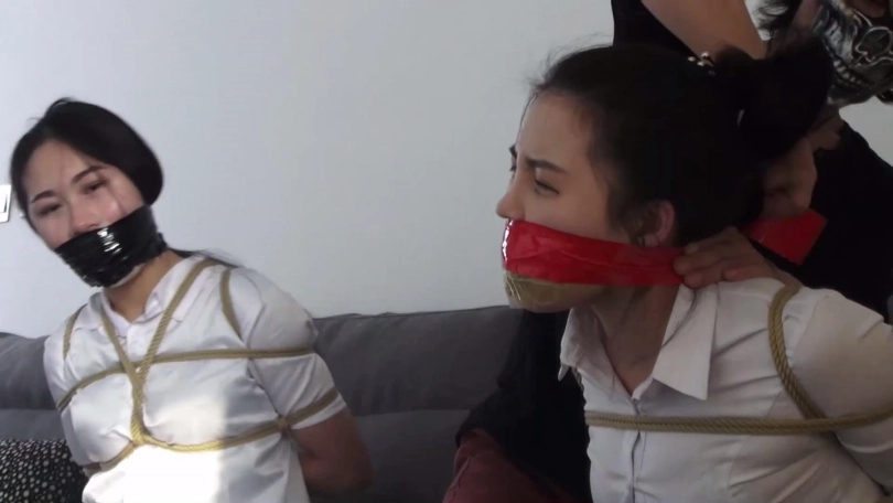 片段3:模特刘娜被一双白棉袜塞满嘴,模特孙甜被几双肉色短丝袜一点点塞满嘴,二人嘴外被透明胶布封住,刘娜嘴外被缠绕黑色静电胶带,孙甜嘴外被缠绕红色静电胶带,最后二人嘴外又被白色纱布缠绕若干圈。