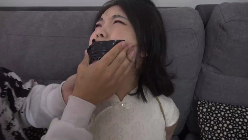 片段7:模特吴晗被一双黑色连裤丝袜塞满嘴,嘴外被蓝色自粘绷带缠绕封住。