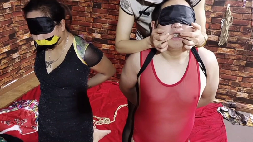 由于柔丝有事要出去,她找到自己穿过很久并没有洗的两条原味内裤,分别拽出夫妻二人口中塞得满满的丝巾丢掉,再让这对夫妻好好品尝自己原味脏内裤的滋味,用丝巾勒住并拿胶带封住他们嘴巴后,给他们二人换成绳索捆绑并且把双腿脚踝也并拢捆绑住。