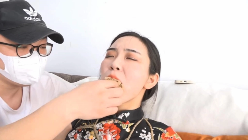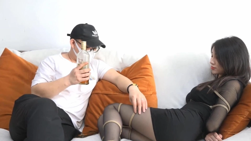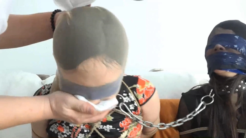 手下:我早接到了情报,两位特工还是老实点吧。林丹丹试图夺枪,却被手下制服。柳洋试图呼喊求救,手下用枪顶住林丹丹的脑袋,威胁柳洋不许出声。之后手下用枪逼林丹丹用丝袜堵住柳洋的嘴,胶带缠绕封嘴。之后用绳子把林丹丹也绑了起来。两位特工耻辱而愤怒的等着手下,任由他捆绑自己。最终柳洋和林丹丹都被堵嘴蒙眼,手下拿来项圈为2人带上,再用铁链连接在一起。2人活动的距离受限,没有机会逃窜。手下脱下二人的高跟鞋,放在一边,之后为二人丝袜套头。柳洋用黑丝林丹丹用肉丝。