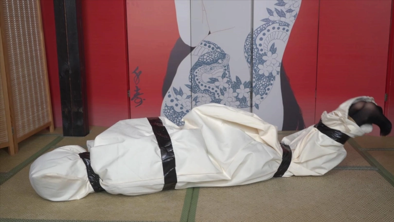 上身后高手捆绑,腿和脚也被绑在了一起,挣扎一段时间后