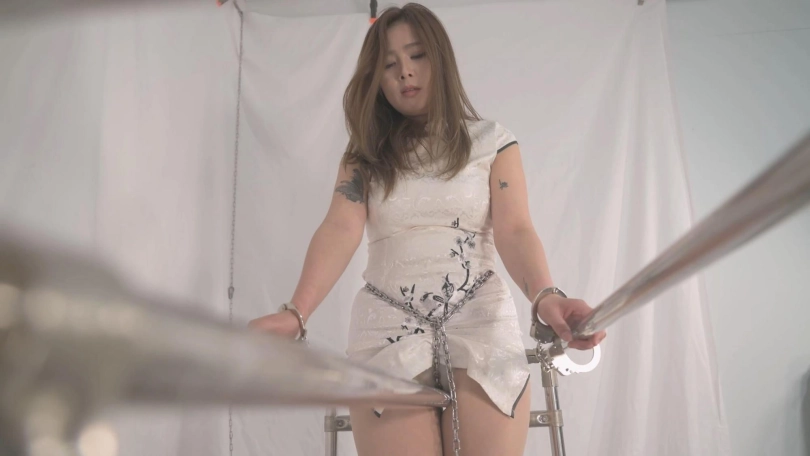 雪碧自己选了穿旗袍,前凸后翘36D的身材立马显现了出来,穿上丝袜高跟,更添性感御姐范,因此本片多采用近距离特写,整个过程充满美感。设计的这个钢管木马,有一条铁链穿过两腿之间锁到脚镣上,她穿着高跟鞋高度正好,还多了一条铁链增加痛苦,用最有震慑的电击器驱赶她来回走动,一开始没有太多压力,脱下她的高跟鞋后,她就只能高高的踮起脚被迫来回走动,感觉瞬间就来了,还差她那销魂的呻吟,那怎么行,立马把她双手铐住吊起,脚上用板铐的手铐铐上,痛的吱吖乱叫还带着哭腔,感觉也到了顶点!