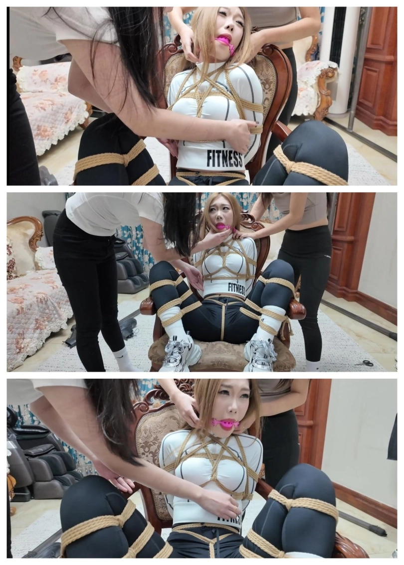 两位女保镖(雨诺和柠琪)已经被结结实实的捆绑在一起,芷溪用黑色绷带缠绕住二人嘴巴,这样即可以防止女人叫喊也可以固定二女保镖头部,让他们的挣扎幅度变小,在二人的肚子处也用黑色绷带缠绕捆绑,近一步加固了对二女保镖的束缚。在麻绳,黑色绷带的双重束缚下,雨诺和柠琪只能轻微地扭动身子并发出呜呜呜呜的抗议声。当然,芷溪可不管这二美女被捆绑得是否难受,也不管这二美女被塞满的嘴巴又多痛苦,只管自己玩乐。芷溪拿出手机。和被捆绑结实的雨诺,柠琪自拍起来,像胜利者和属于她的两个战利品的自拍!自拍了多个姿势后,芷溪稍显疲惫,检查了雨诺和柠琪身上的绳索是否松动,检查了二美女的堵嘴物是否还塞满口腔后,都确认捆绑,堵嘴,封住都结实后,芷溪离开前去房间休息!芷溪离开后,二美女在地上努力扭动身子,挣扎着,试图解开身上的束缚,可是她们除了扭动身子和发出呜呜呜呜的声音还能做什么呢?解开麻绳加黑色绷带可没那么容易!