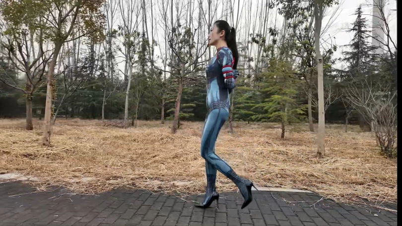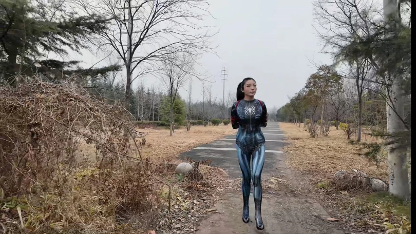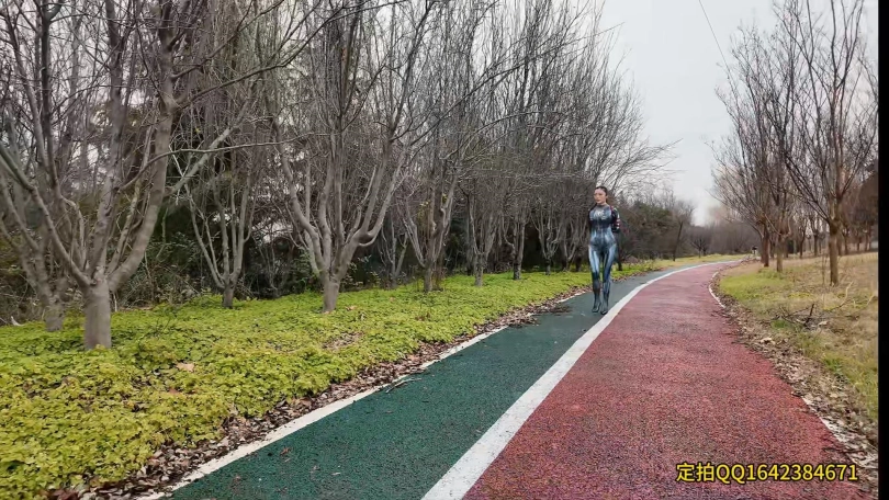 佳佳女蜘蛛装扮,户外散步行走,第一次拍户外题材,佳佳和我内心还是非常紧张的,找了个绿化带,冬天的户外还是很冷的,佳佳非常敬业,五花大绑,不愧之前做过模特队长,走路还是标准的模特步,身段更显优美