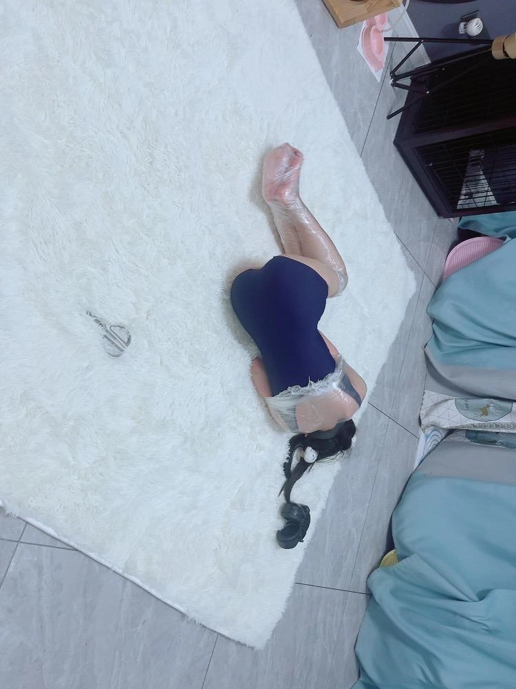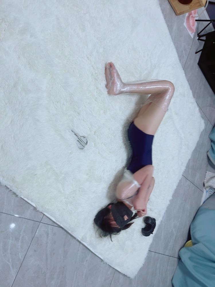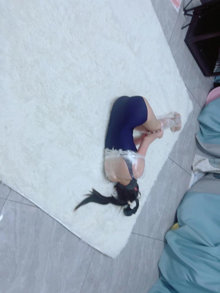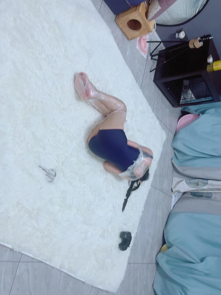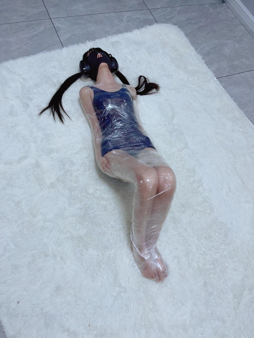 保鲜膜全包别有一番风味:完全透明的保鲜膜包裹着茶茶的身体,白皙的腿和粉嫩的脚底若隐若现,展示感拉满~可以透过保鲜膜完全看到茶茶在内部挣扎的状态,足控也能欣赏脚趾动弹的可爱样子。