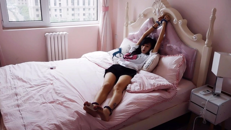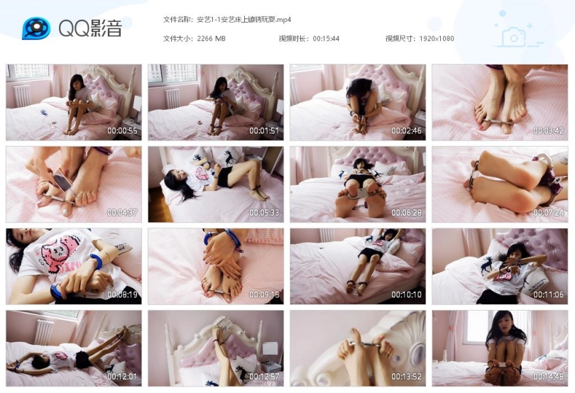 妹子回家,坐到床上,脱下鞋子,袜子,戴上手铐、脚铐、脚趾铐。涂指甲油。展示,换不同姿势。