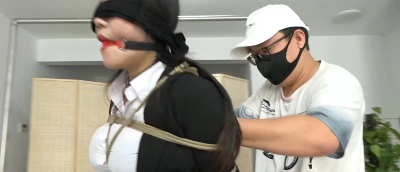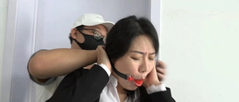 王丽(李然饰演)穿着标准的OL制服,腿上穿着肤色裤袜与黑色高跟鞋,正在参加公司组织的舞会,喝酒喝到一半觉得有些上头,于是便去卫生间补了补妆,顺便清醒一下,不想从卫生间出来的时候忽然被蒙面人捂住了嘴巴,并被强制塞入了一个口球,并被丝袜蒙上了双眼。王丽此时酒还没醒,根本就没有力气反抗,只得任由蒙面人将自己紧紧束缚起来……