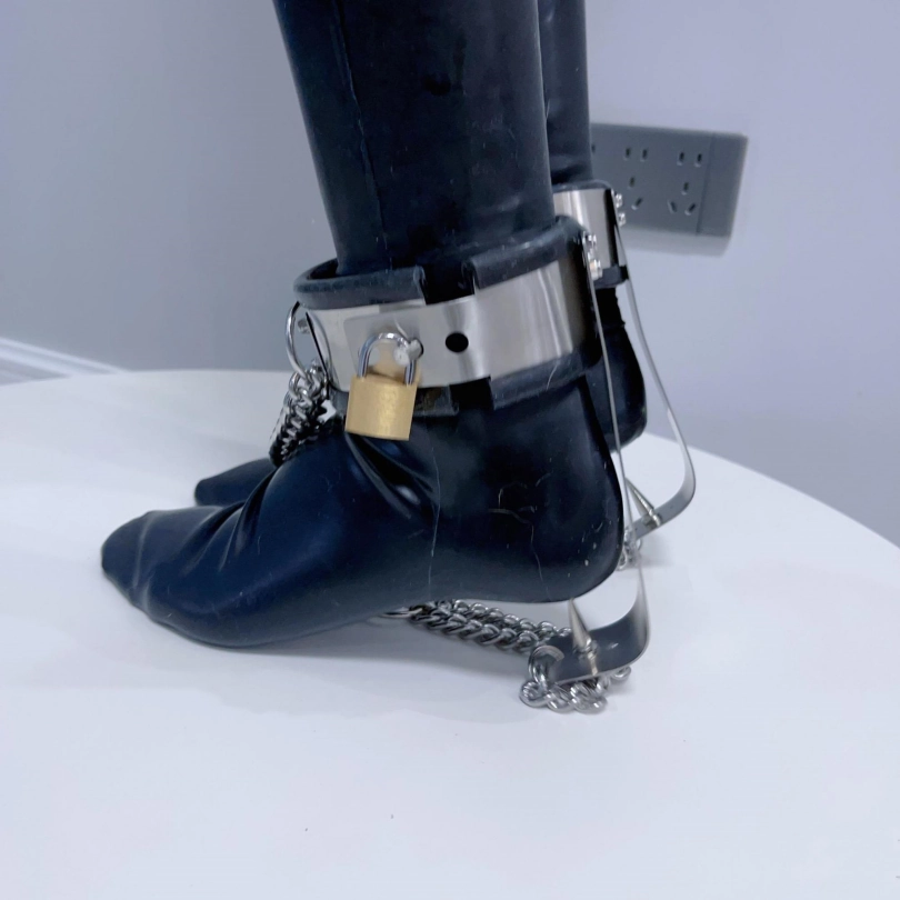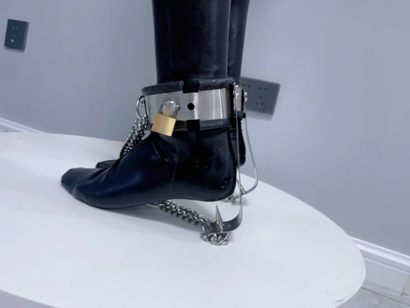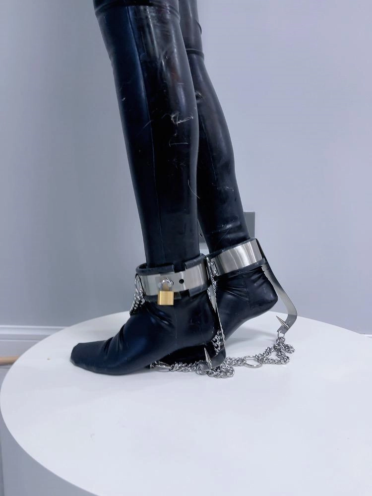 正好茶茶买了尖刺脚镣,锁在脚腕上之后足底的尖刺会强迫女孩垫脚尖,否则脚底就会被锋利的铁刺刺破。