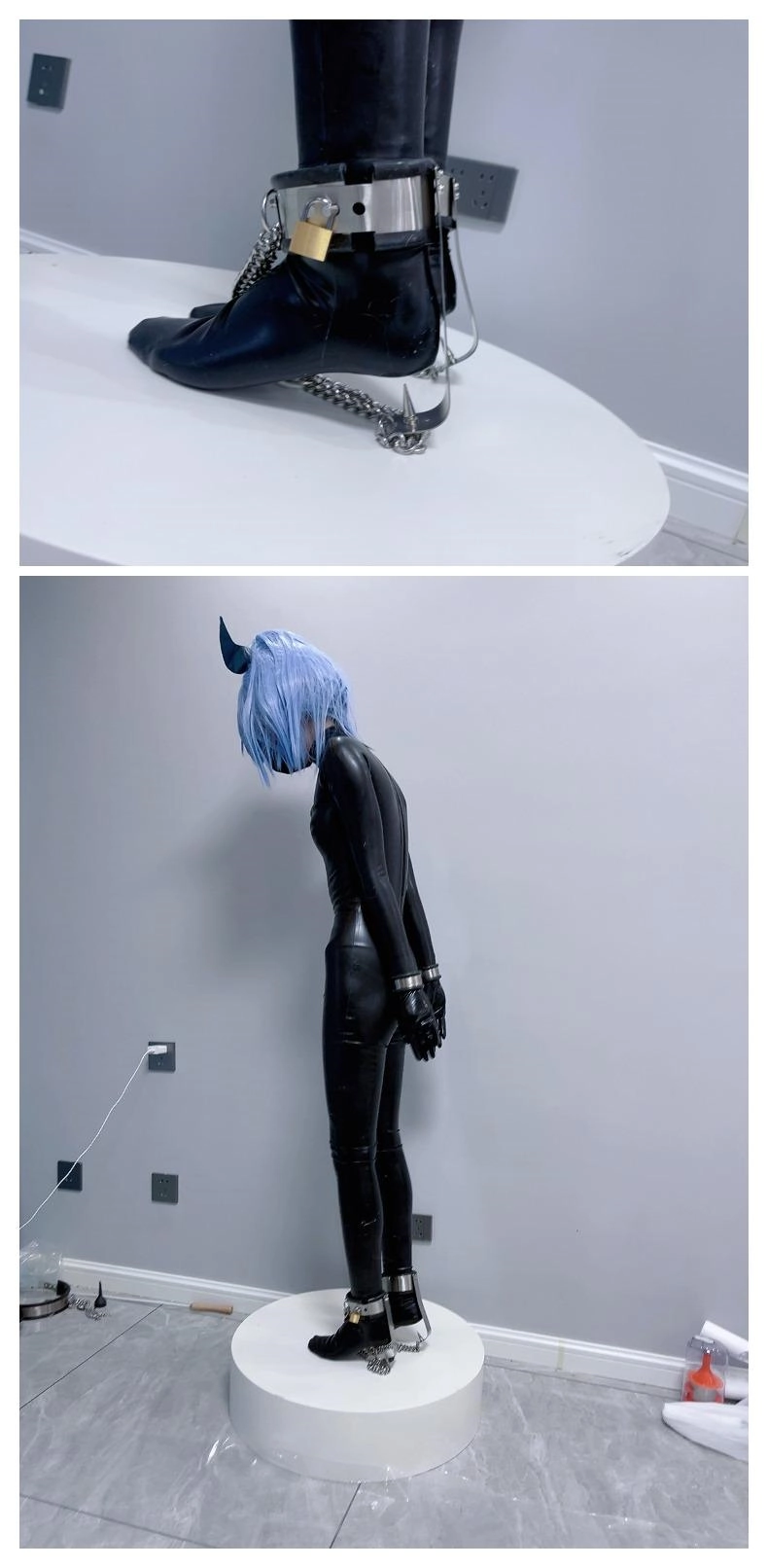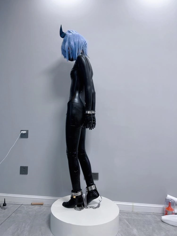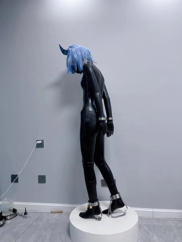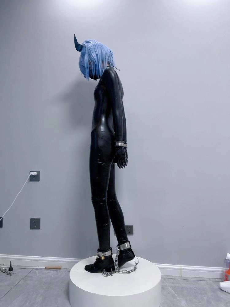 可怜的魔法少女就这样穿上羞耻的胶衣,双手被反铐在身后,艰难的维持着平衡。最要命的是脚底的尖刺镣铐,只要稍微维持不了平衡冰冷的尖刺就会狠狠刺痛脚底。这可是真正的刑具,一刺下去不受伤是不可能的。少女只能羞耻的站在收藏用的手办台上,被冰冷的刑具强制接受踮脚的惩罚,疯狂的压榨着少女的体力.....