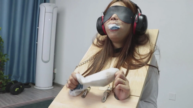 紧接着,代表囚犯身份的木枷被抬了上来,被戴上木枷的犯人更加清楚了自己的处境,她被告知要带着木枷和脚镣进行游街!当然了,嘴里还需要塞着自己的原味棉袜,不仅如此,她必须将另一只原味棉袜的脏袜底用手展示出来。