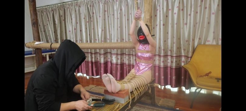 戴上眼罩戴上鼻钩和新买的口塞。下面塞一个[X_X]。便开始用各种工具挠她的脚心,女侠一边笑一边挣扎,然后用好几种工具疯狂挠她的腋下,女侠大笑,一会定住一会解开挠她,还顺带挠她的腋下和肚脐。挠完还鞭打和用电棍电她,扎她的脚女侠被扎的一直闪躲。老k便把她大拇指绳子连接到腿上,这样女侠脚就无法闪躲了。女侠便只能忍受折磨。老k拿电棍电她的脖子,腋下和胸部,模特演出那种电的抽搐的感觉,玩的差不多。老k想让女侠做他助手,女侠听完疯狂摇头,老k很生气,把挠脚道具全用疯狂挠她的脚心,女侠笑的受不了晕了过去。醒来被戴上头套,这个头套我抹了肌肉胶水,戴上之后没有我的药水是拿不下来的。拿出两双臭丝袜。塞到嘴里戴上口球(说一下这个是会放电的口球)女侠便呜呜的叫。一只放到鼻子上拿绳子绑上。女侠表现出恶心呕吐的感觉。女侠被熏的难受????,做个样子就行。开始挠脚心用不同工具疯狂持续挠脚心折磨,并且电她,期间可以穿插定身挠痒。女侠疯狂大笑。为了让她屈服,老K给她脚上和腋下喷上催痒剂。女侠有了反应呜呜的笑,又用电击器持续电击,女侠被电的抽搐,然后定住又挠痒电击,折磨到女侠没有力气了。拿出原味内裤套上又套上一层丝袜。然后拿出发明的蜡像喷剂,从头到脚喷上女侠就被变成蜡像。为了保险又喷上一层固化剂,女侠被完全定住没有知觉。老k敲了敲她身体特别硬。开始折磨女侠,用各种道具挠腋下脚心,电击她鞭打她,女侠都没反应。老K把电击器绑到女侠[X_X]处,一直开着女侠感觉是一直有的,你就在这当我的玩具吧,女侠被放置在这特写。