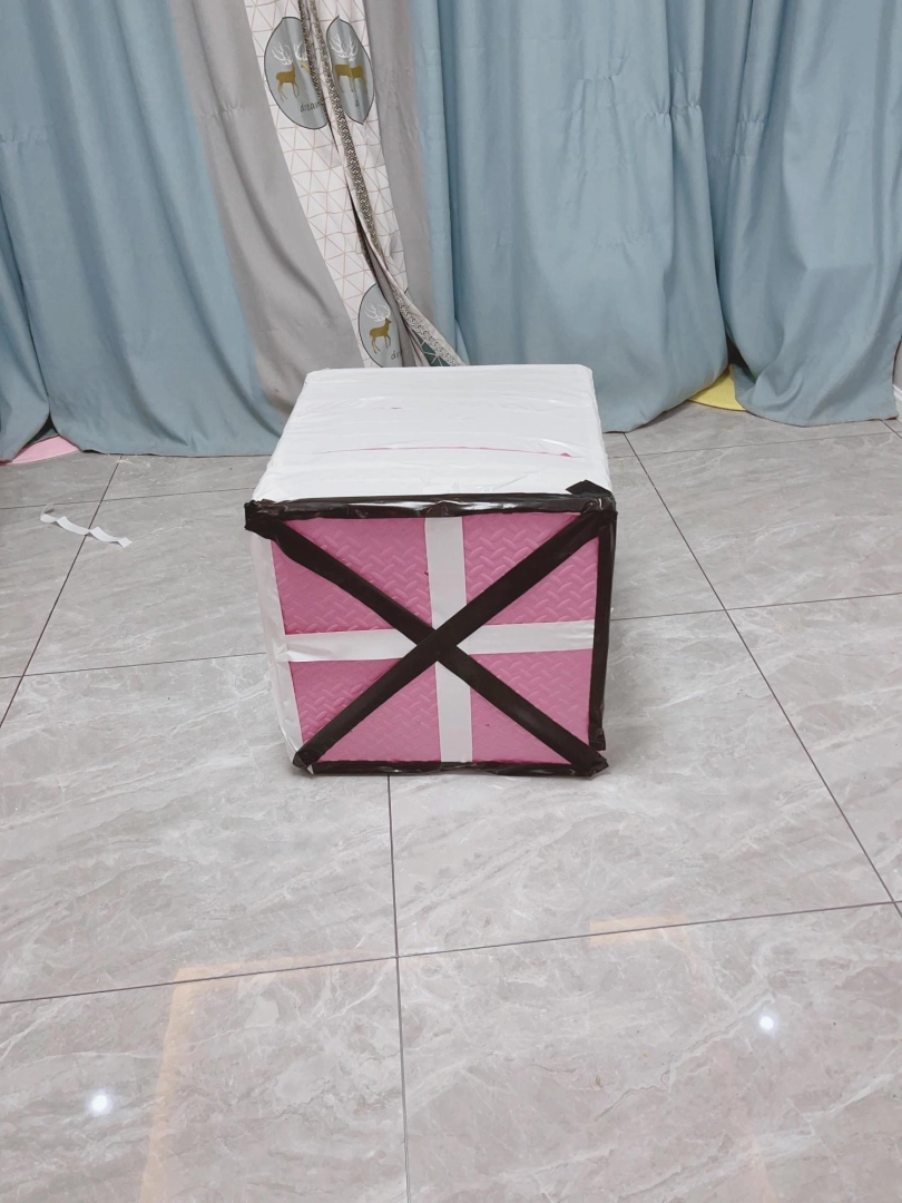 当然,牢固上也不能放过:在箱子内侧每条接缝处用布基胶带封好加固、然后在箱体外侧的4个面用布基胶带仔细包裹每一个角落,头顶的盖子在茶茶进入后用布基胶带多道加固,先X型贴胶带加固,然后横竖多道分别加固,保证牢固。