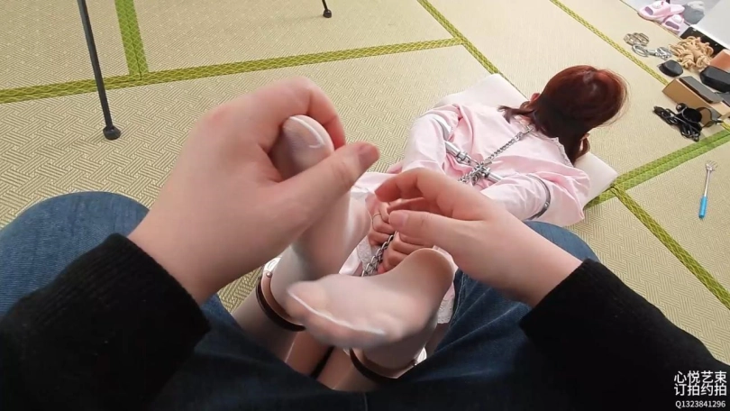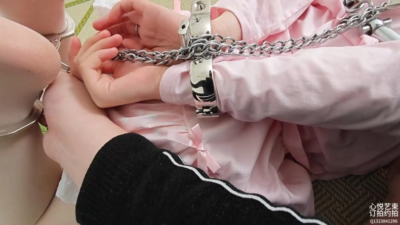 拿出了我差不多一半的镣铐,原本想用金属细铁链做绳子增加捆绑的,奈何时间不够了。不过目前的拘束也是相当给力。全金属,手铐,肘铐,项圈,脚铐,拇指铐。统一用一条铁链连接。保持驷马姿势玩弄全身,硬了硬了。