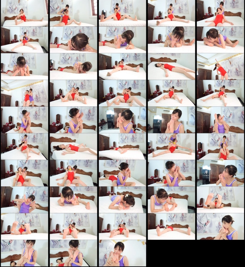 May (Red Leotard) got knocked out by June multiple times. June then spent most of the time worshipping May`s feet. The girls wore pantyhose in this video.