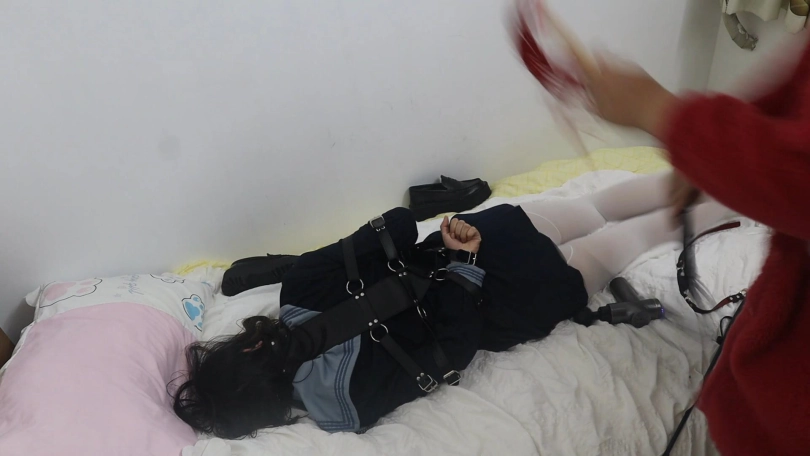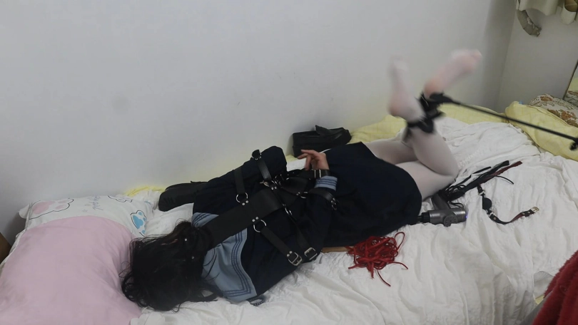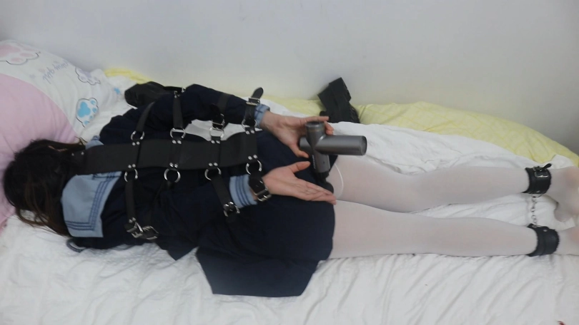 让拘束带铐住的白丝水手服本玥跪在镜子前,