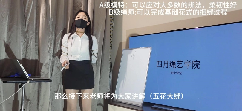 我们邀请到了专业的绳模,绳师,小月老师担任主讲老师,为大家讲解五花的绑法。老师亲身为大家展示了五花的要点和上身绑法。