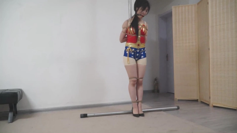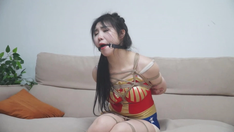 女主被绑着的时候,男主过来说,我就喜欢捆绑神奇女侠,我这有一套服装,你去给我换了。出来男主把神奇女侠复杂式日式捆绑,腿并排捆绑,马具口球,只要一点捆绑过程,然后男主把女主直接捆成驷马,注意不要松松垮垮的!最后把神奇女侠捆绑在柱子上,龟甲和日式后高手,双腿也捆绑整齐,女主挣扎,然后毛巾嘟嘴绷带缠绕,解开腿,一条腿半吊起来,一条腿捆绑在柱子上,最后女主挣扎到没力气,完!