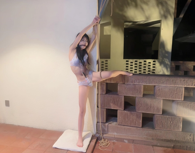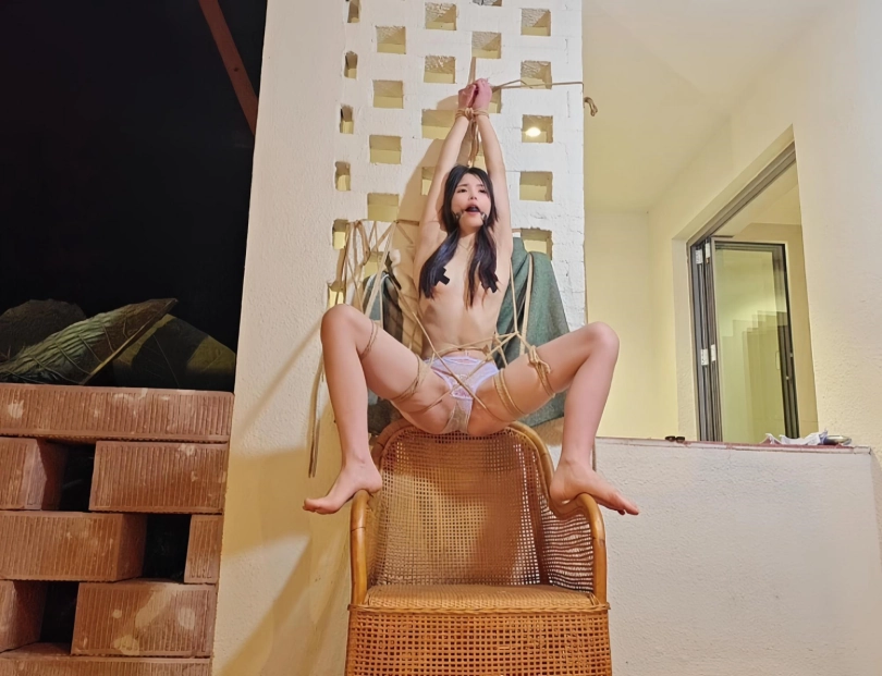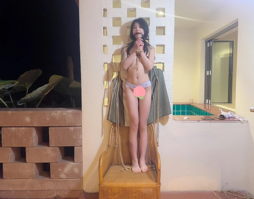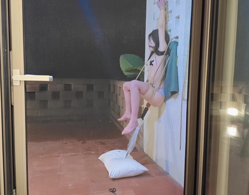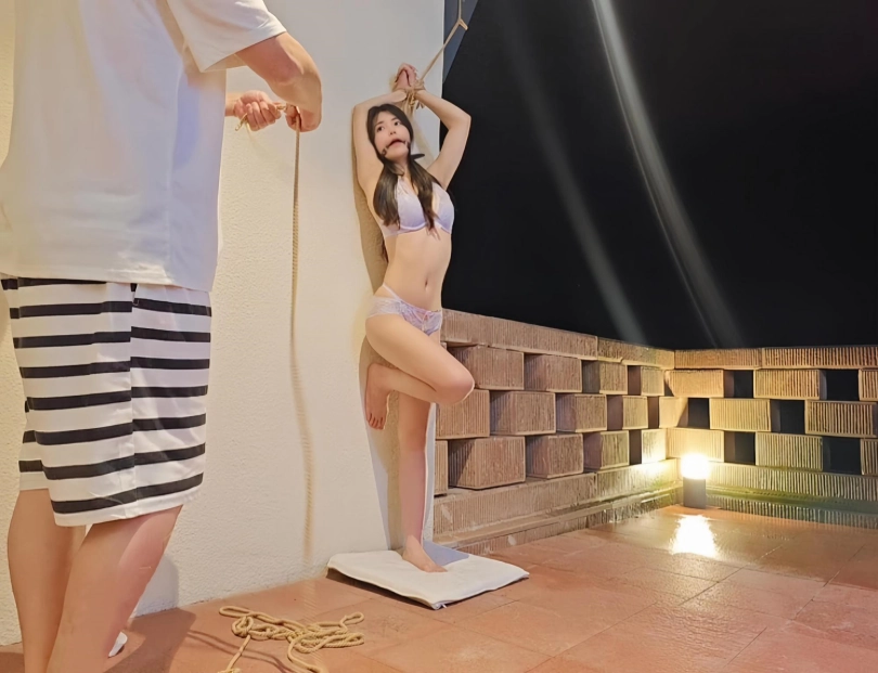 以为主人边喝茶边欣赏完捆绑挣扎的我就很快就会结束了,可是这只是夜晚来临前的小插曲,正真的游戏才刚刚开始,,外面下着小雨,,,他粗糙的把我扛到了外面的露台上,,在这海拔2000多的山上,又下着小雨,感觉好冷,,,不知不觉中,就被挂到了墙上,,,然后,,,,,雨伞加上棒子加上假玩具固定,此生真的是第一次尝试,关键是隔壁住的有人,还不敢呜呜大叫,,突然楼下传来声音,,民宿工作人员夜晚巡逻路过,,吓得大气都不敢出一下,,他们要是知道自己的女神此时此刻被一丝不挂的吊缚在露台上,离他们不到10米远,会是什么后果,,完全不敢想,,太羞耻了,我确实无法描述了,视频中见吧。