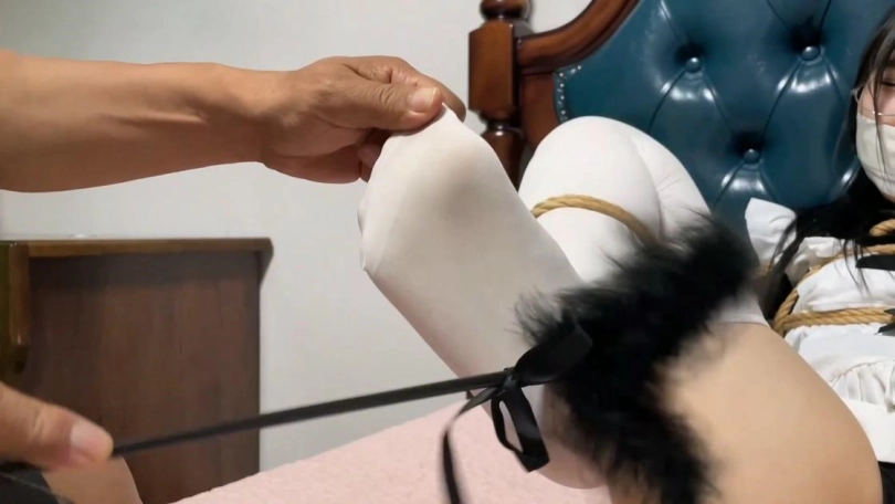 男人出现强制她分开双腿对着镜头。用毛刷肆意玩弄她的丝袜脚。