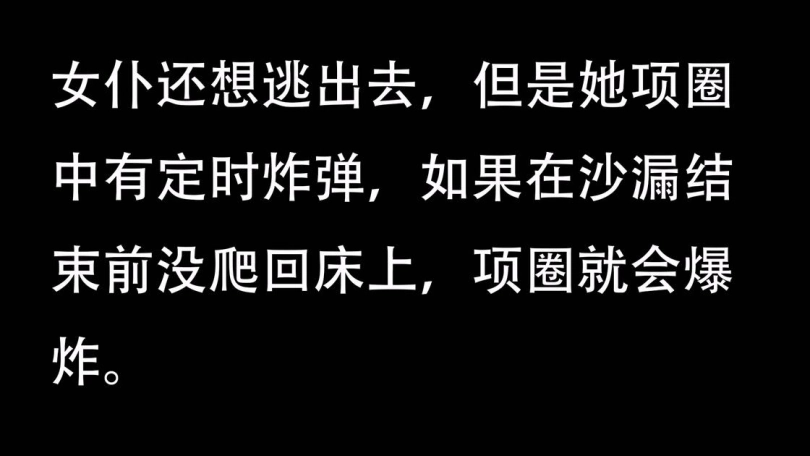 他说如果美女不逃跑什么事都没有,但她作为侍寝女仆离开床,那她项圈里的定时炸弹就会启动,她必须在沙漏结束前爬回床上,否则炸弹就会引爆。