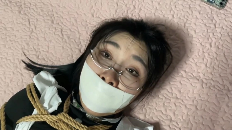 卧室大床上。 美女迷迷糊糊的醒来,发现自己被折叠双腿捆绑,发型改为马尾辫。脖子上有个金属项圈。